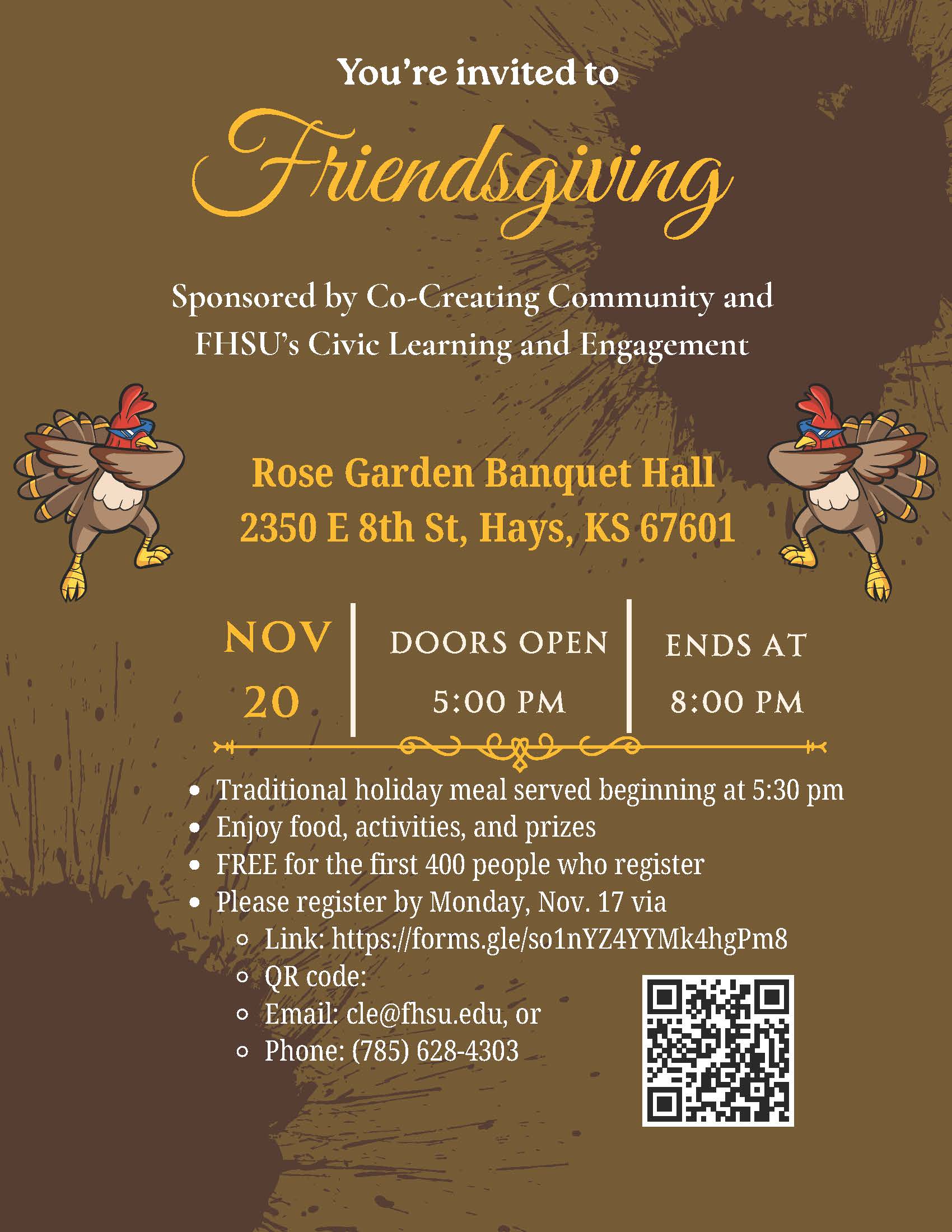 Co-Creating Community, Friendsgiving. Thursday, November 20, 2025. 5 - 8 PM. Rose Garden Banquet Hall, 2350 East 8th Street, Hays, KS 67601.