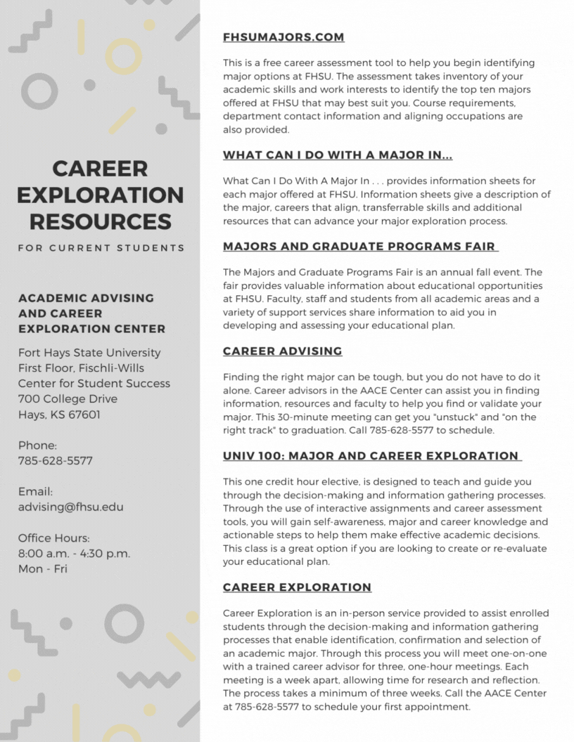 The Career Development offers a variety of services to enable students in identifying, selecting, and confirming their academic major at FHSU. Chose the appropriate category below to find the services that best fit your needs.