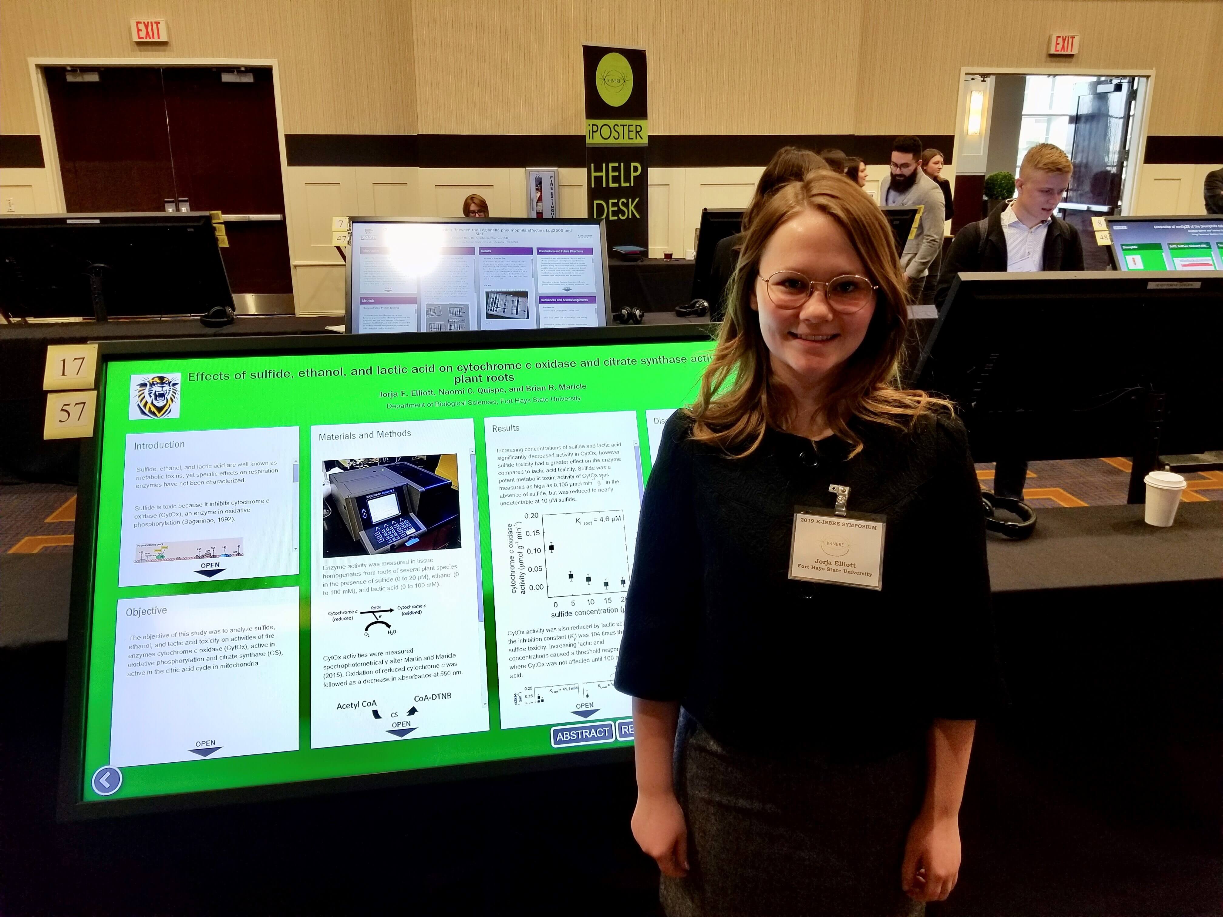 KAMS senior Jorja Elliott presented her research this past week at the 17th Annual Kansas-IDeA Network of Biomedical Research Excellence Symposium in Overland Park, Kan. Her research focused on the effects of sulfide, ethanol, and lactic acid on cytochrome c oxidase & citrate synthase activities in plant roots.